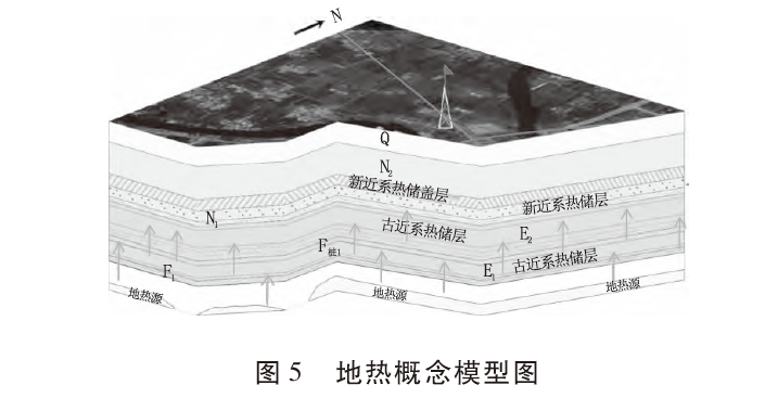 綜合與前人資料與本次淺部地溫測量、氫氧同位素地球化學測試、區(qū)內(nèi)典型地熱井的抽水試驗等成果,分別從熱源、熱儲層、蓋層、地熱流補給及運移通道建立了勘查區(qū)熱儲概念模型(圖5)。