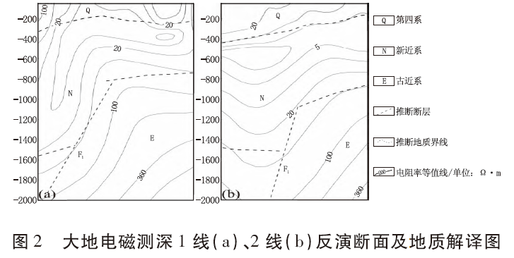 勘查區(qū)內(nèi)主要斷裂構造均為區(qū)域性斷裂的次生斷裂,主要有NNE向張完集斷裂F1和EW 向的渦河斷裂F推1(圖1)。前人在區(qū)內(nèi)布設有兩條大地電磁測深平行剖面(1線、2線),通過明顯的“V”型寬大低阻異常和同步向下彎曲典型斷裂異常特征,于區(qū)內(nèi)東側(cè)邊界解譯推斷了走向約40°、NWW 傾的張完集斷裂F1(圖2)。渦河斷裂F推1位于勘查區(qū)南側(cè)亞珠石油城—化肥廠一線,該斷裂為亳州隆起的北界斷裂,其主要通過重力資料推測為EW 走向、N傾的正斷層。