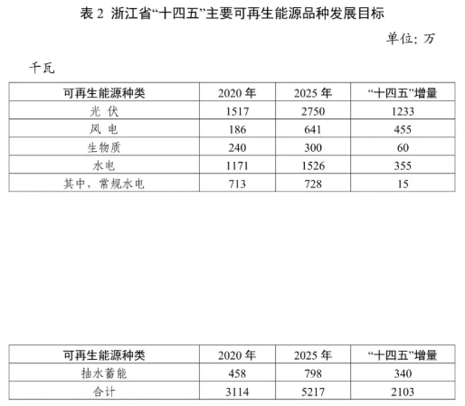 大力發展風電、光伏,實施"風光倍增計劃"; 更好發揮以抽水蓄能為主的水電調節作用;因地制宜高質量發展生物質能、地熱能、海洋能等。到 2025 年底,可再生能源裝機超過 5000 萬千瓦,裝機占比達到 36%以上。我省"十四五"主要可再生 能源品種發展目標如下∶