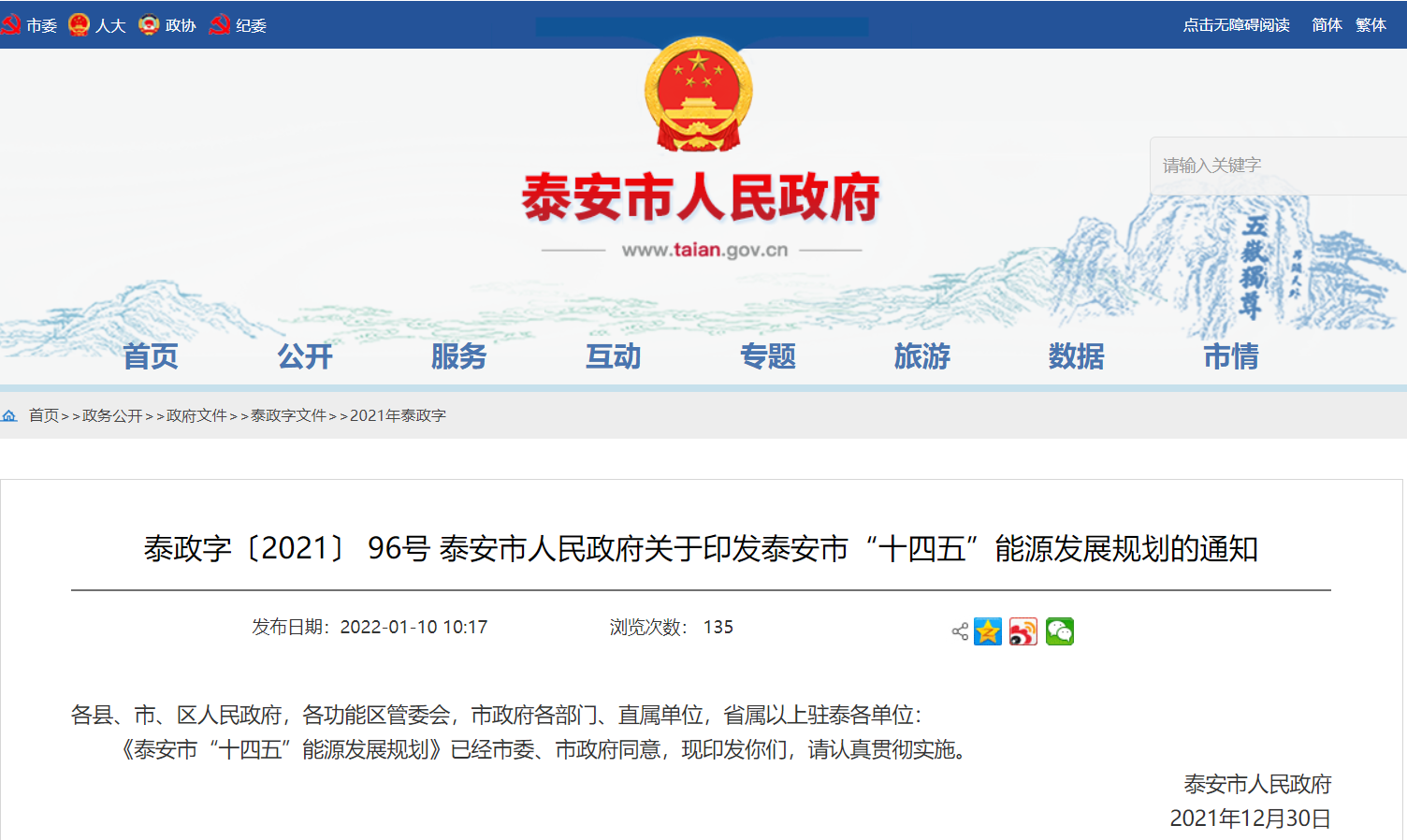 近日,山東省泰安市人民政府印發(fā)《泰安市“十四五”能源發(fā)展規(guī)劃》(以下簡稱《規(guī)劃》)。“十四五”期間,泰安市圍繞堅持“創(chuàng)新驅動、綠色低碳、效率優(yōu)先、多元互補、智能共享”的基本原則,加快構建清潔低碳、安全高效的現(xiàn)代能源體系,深入推進能源生產和消費方式變革,進一步促進全市現(xiàn)代能源經濟高質量發(fā)展。