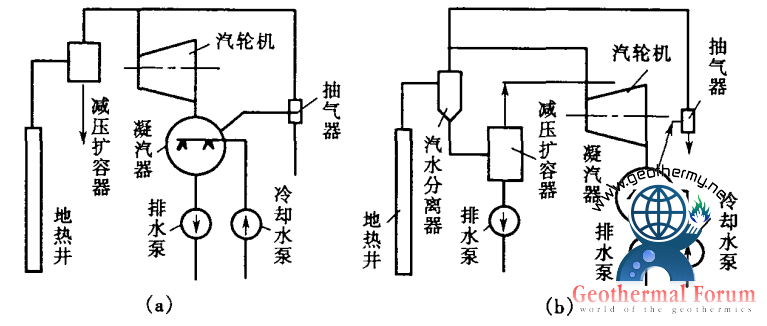 閃蒸地熱發電系統是一種比較適用于中低溫地熱水發電的系統(又稱“減壓擴容法”),圖1所示為這種系統的流程圖。來自地熱井的熱水首先進入閃蒸器(減壓擴容器)(圖1-a),容器內維持著比熱水壓力低的壓力,因而部分熱水得以閃蒸并將產生的蒸氣送往汽輪機膨脹做功發電。如地熱井口流體是濕蒸氣(圖1-b),則先進入汽水分離器,分離出的蒸氣送往汽輪機做功發電,分離剩余的水再進入閃蒸器,閃蒸后得到的閃蒸蒸氣也送往汽輪機做功。