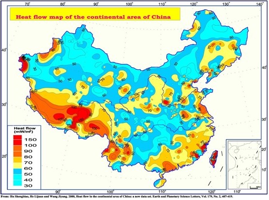 中國東部,高地溫梯度異常區多分布于松遼盆地、華北盆地及東南沿海地區,地溫梯度多在4-5.°C/100m,最高可達7-8°C/ 100m,其分布多呈條帶狀,北東向延伸同地溫分布規律一致。