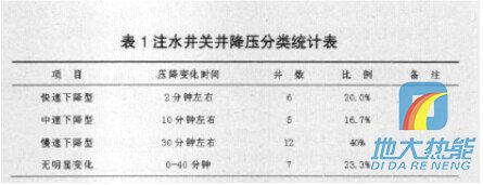 為確定合理降壓時間,在我隊(duì)30口注水井洗井過程中觀察注水井壓力隨關(guān)井時間的變化,以短時間(60分鐘)壓力出現(xiàn)直線段或相對直線段統(tǒng)計,歸納總結(jié)如表1所示的幾種類型:快速下降型、中速下降型、慢速下降型、無明顯變化型。 根據(jù)調(diào)查統(tǒng)計結(jié)果,來確定不同類型的關(guān)井降壓時間:快速下降型的井只需關(guān)井3 ̄5分鐘;中速下降型的注水井需關(guān)井10 ̄15分鐘;慢速下降型的注水井需關(guān)井降壓30分鐘,無明顯變化型的注水井可直接洗井(洗井時應(yīng)觀察壓降的變化)。為此關(guān)井降壓的最佳時間應(yīng)該是壓降變化趨于穩(wěn)定的時間,較為合理。