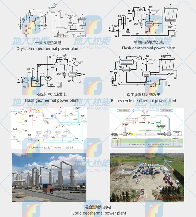 地熱發電需根據地熱流體的溫度、壓力以及它們的水、汽品質的不同而采取不同的設計方案。其主要類型包括:干蒸汽地熱發電、單級閃蒸地熱發電、雙級閃蒸地熱發電、一井一站地熱發電、混合型地熱發電、雙工質循環地熱發電、干熱巖發電。