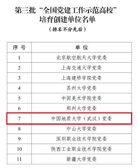近日,教育部下發(fā)了《教育部辦公廳關(guān)于公布第三批全國黨建工作示范高校、標(biāo)桿院系、樣板支部培育創(chuàng)建單位名單的通知》,公布了第三批新時代高校黨建示范創(chuàng)建和質(zhì)量創(chuàng)優(yōu)工作評審結(jié)果,遴選產(chǎn)生了11個全國黨建工作示范高校、100個全國黨建工作標(biāo)桿院系、1000個全國黨建工作樣板支部。中國地質(zhì)大學(xué)(武漢)黨委入選“全國黨建工作示范高校”培育創(chuàng)建單位,環(huán)境學(xué)院“張國旗班”黨支部、工程學(xué)院勘察與基礎(chǔ)工程系黨支部入選“全國黨建工作樣板支部”培育創(chuàng)建單位。