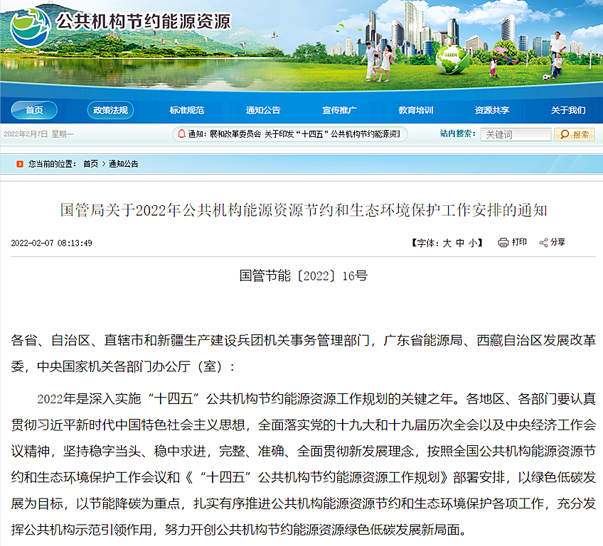 地大熱能清潔低碳能源網訊:國管局發(fā)布《關于2022年公共機構能源資源節(jié)約和生態(tài)環(huán)境保護工作安排的通知》。通知指出,全面落實節(jié)能降碳有關工作: