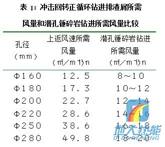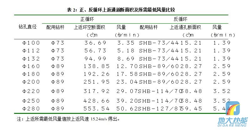 基巖水井通常口徑為Φ160~Φ280mm之間,該口徑硬巖的鉆進效率低,成本高,施工周期長,成為鉆探界亟待解決的難題。20世紀70年代開始,我國已引進潛孔錘技術(shù)應(yīng)用于水井鉆鑿,鉆進效率數(shù)倍提高,展示了潛孔錘鉆進的良好前景。但水井工程,孔深大,背壓高,配套使用的空壓機不但風(fēng)量要求大,風(fēng)太也高,使鉆進成本大幅度增高。主要矛盾是滿足排渣屑上返風(fēng)速的要求時,供風(fēng)量巨大,遠超過了潛孔錘本身工作的需求。計算不同孔徑條件下滿足上返風(fēng)速15m/s供風(fēng)量的需求,見表1(Φ89鉆桿為例)。表1數(shù)據(jù)表明,孔徑越大,為滿足排渣屑要求而消耗的能量越大,經(jīng)濟性越差。若實施反循環(huán)鉆井技術(shù)工藝,則排渣屑所需風(fēng)量大大減小,如表2所示。